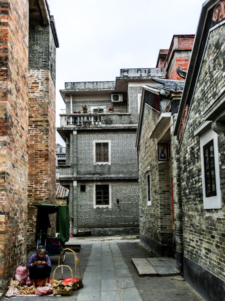 We walk along the alley which brings us to the fortresses. Everything is calm, not a sound, the sky is grey and the air is heavy. We see four old ladies chilling right after we passed in front of a room where people of all ages were playing cards (it was called: Fortress History Exhibit Hall, it has apparently changed since). The four old ladies indicate the path to us. We enter this sort of residential area where all the houses/buildings look like little castles. The little glimpses we get of the interiors reveal piles of unidentifiable pieces of plastics, chickens in cage, and various household electrical appliances but everything seems empty. Not one person. We continue on our way, ready to get lost in the alleys.