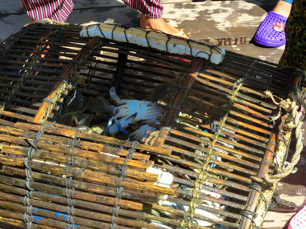 Wooden boxes filled with small crabs are floating in the ocean, we made it to the market! A row of pots filled with hot water and what appeared to be customers were waiting in front of them. We put two and two together and figured that we had to order the crabs from the sea ladies and they would cook it for us in the pots. We were sold, let the negotiations begin! $1 per crab is the norm, we were able to get 4 small crabs for $2 and 3,500 riel ($0.75) for fried bananas. We waited less than ten minutes and voilà! Lunch was served. There is also an array of restaurants offering grilled seafood along the beach next to the market.